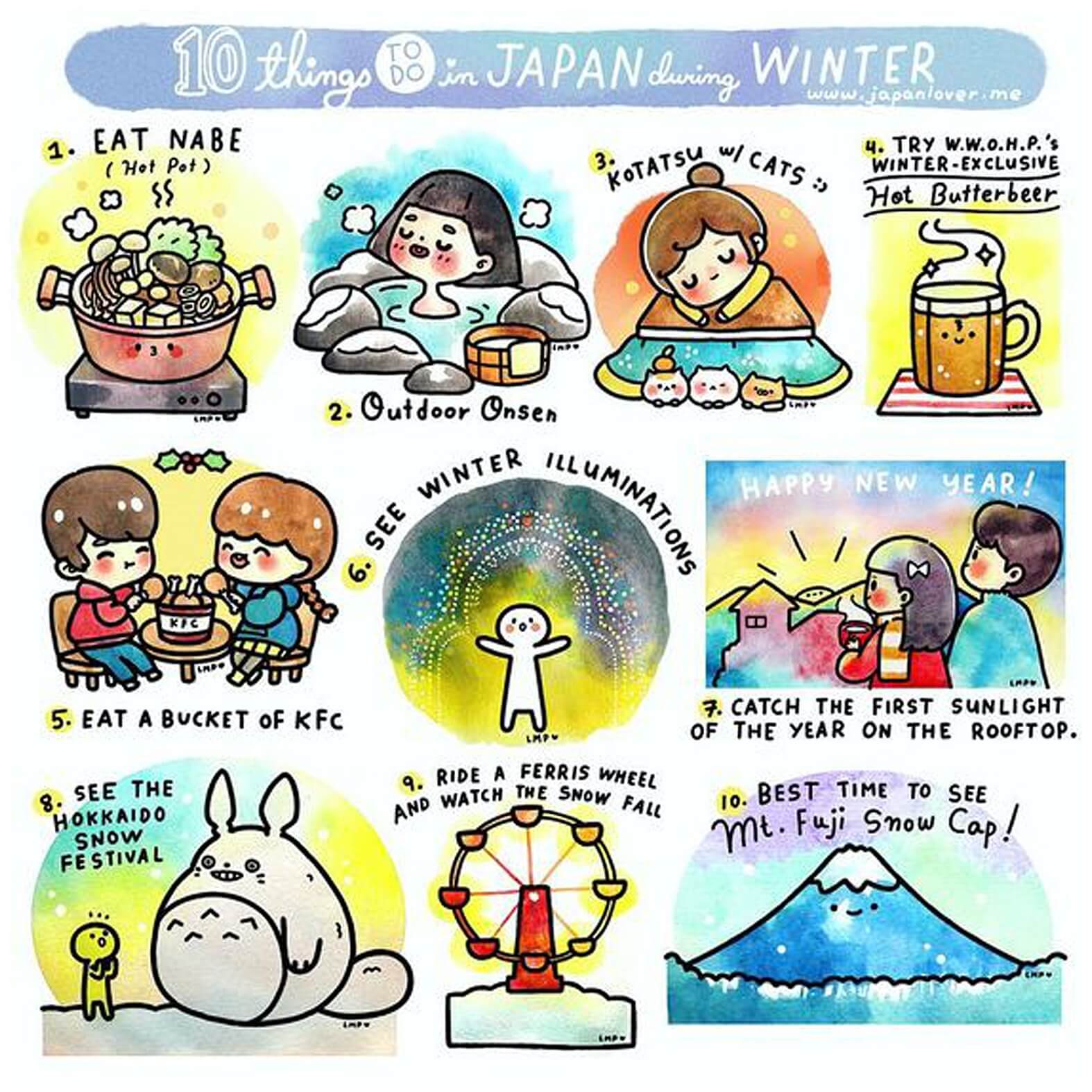 חורף – חל בחודשים נובמבר עד אמצע מרץ. העונה האידאלית לביקור ביפן עבור חובבי הסקי והאונסנים {מרחצאות יפניים מסורתיים}.