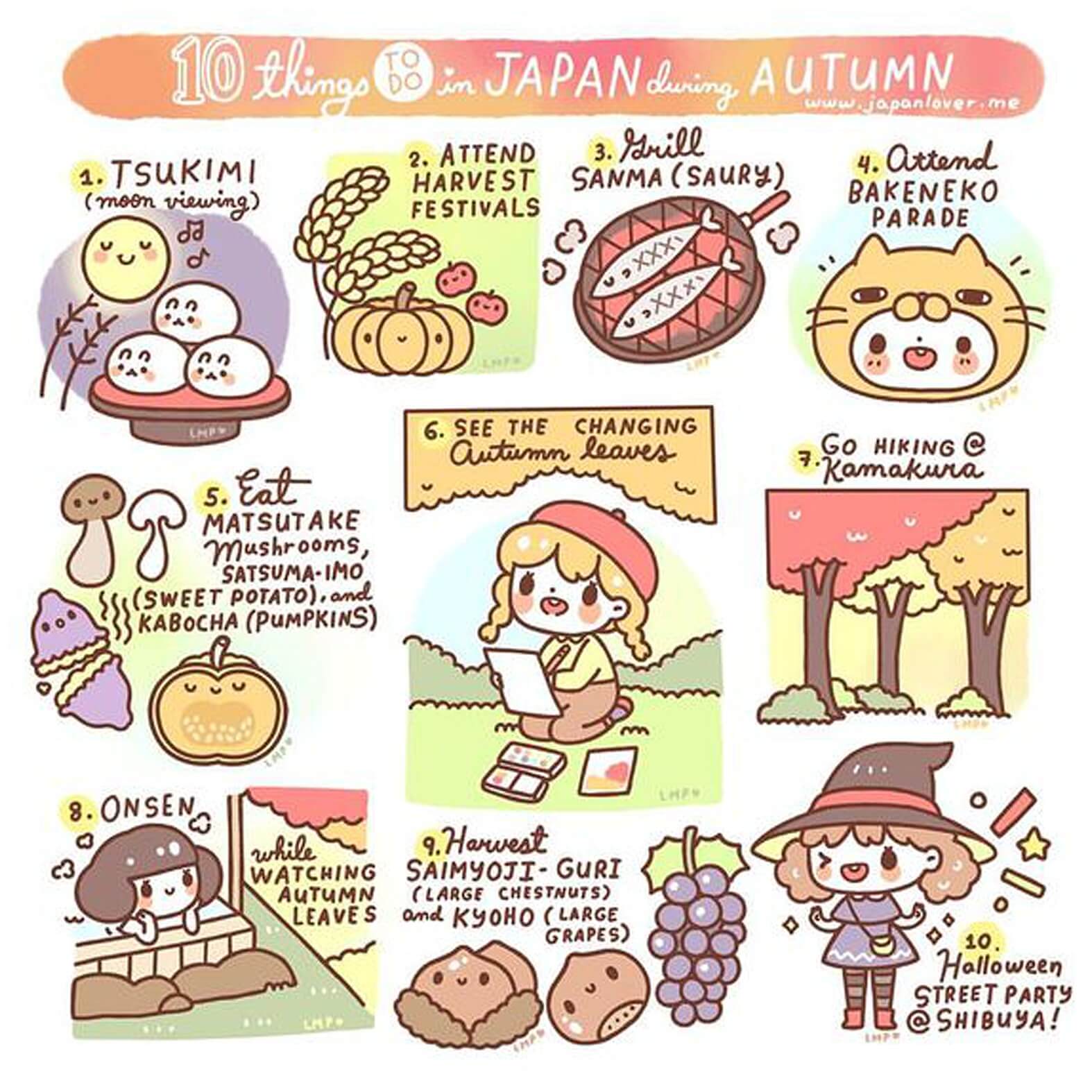 סתיו – חל בחודשים אוקטובר עד נובמבר. מזג האוויר הנעים הופך את הסתיו לעונה האידאלית לביקור ביפן, והיא גם מפורסמת בזכות השלכת האדומה שהופכת את הנוף לציורי במיוחד. שימי לב שגם בשיא העונה הזו את עלולה לחוות עומס תיירותי.