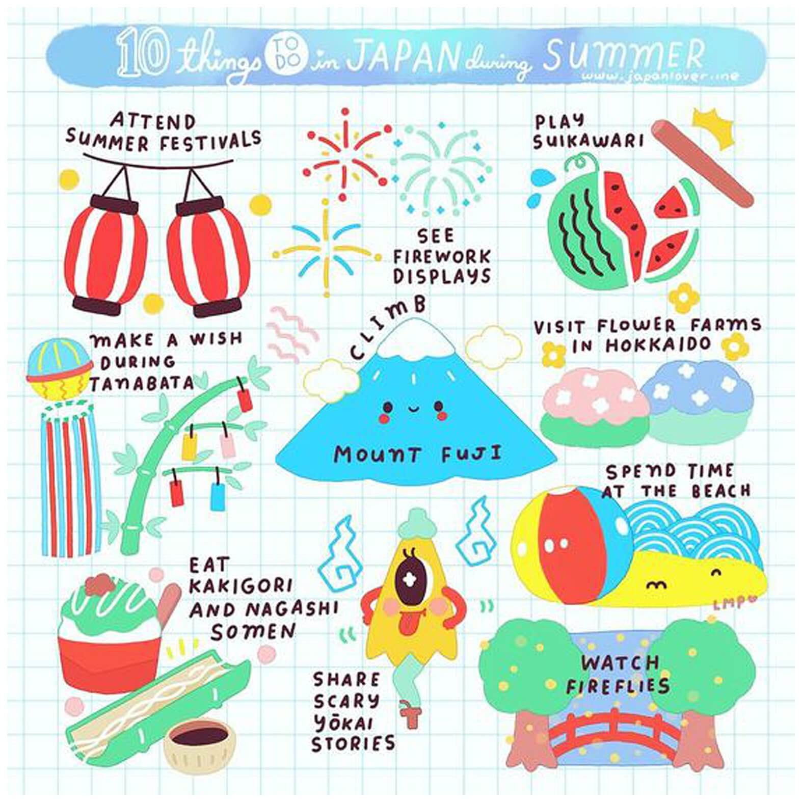 קיץ – חל בחודשים יוני עד ספטמבר. הקיץ נחשב לעונת הטייפונים ומאופיין בלחות גבוהה במיוחד, אבל אם זה לא מרתיע אותך כדאי שתדעי שזו העונה שבה נחגגים פסטיבלים צבעוניים רבים לאורך המדינה, וגם העונה שמתאימה לטיולים רגליים באלפים היפניים ואו לנופש באזורי החוף של המדינה.