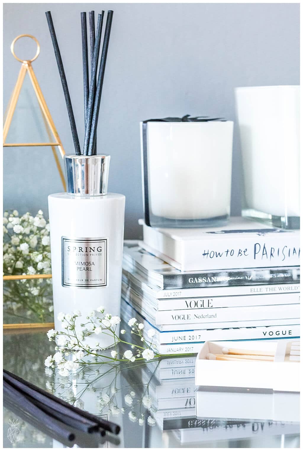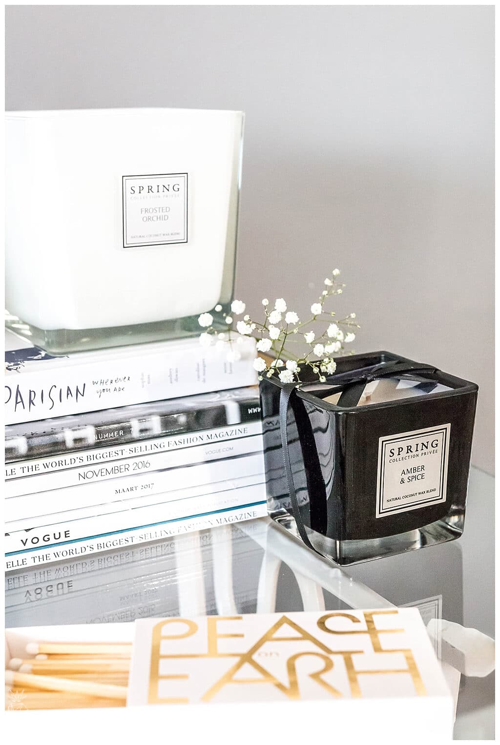 → Vintage SINGER Dresser – The SINGER's old sewing machine, which has been converted into an ornament dresser, has been painted and upgraded more than once in the past. In its current incarnation, it was sprayed in white, and it’s definitely the most flattering color it had since I bought it more than ten years ago. The upgrade cost only 12 dollars {the price of 5 spray bottles} and made an amazing change at our home, so I always recommend first checking what can be changed and renovated at home before making unnecessary purchases of new items. On top of the dresser, I placed the Spring Private Collection's beautiful candles and diffusers on a pile of black and white newspapers and books, beside which I placed my favorite matchbox I had purchased during my last visit to Amsterdam.